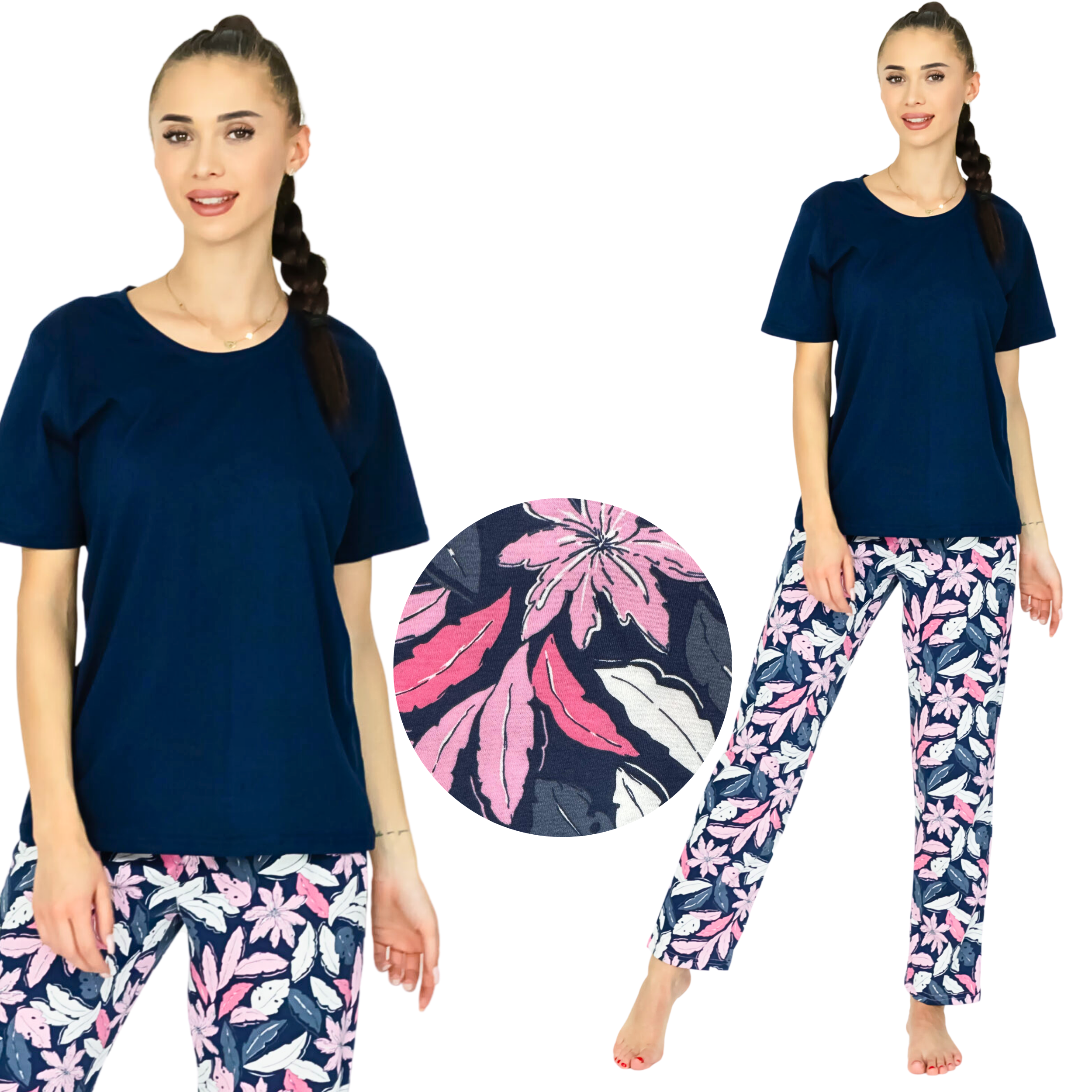 Bawełniana piżama damska krótki rękaw, długie spodnie M-XXL