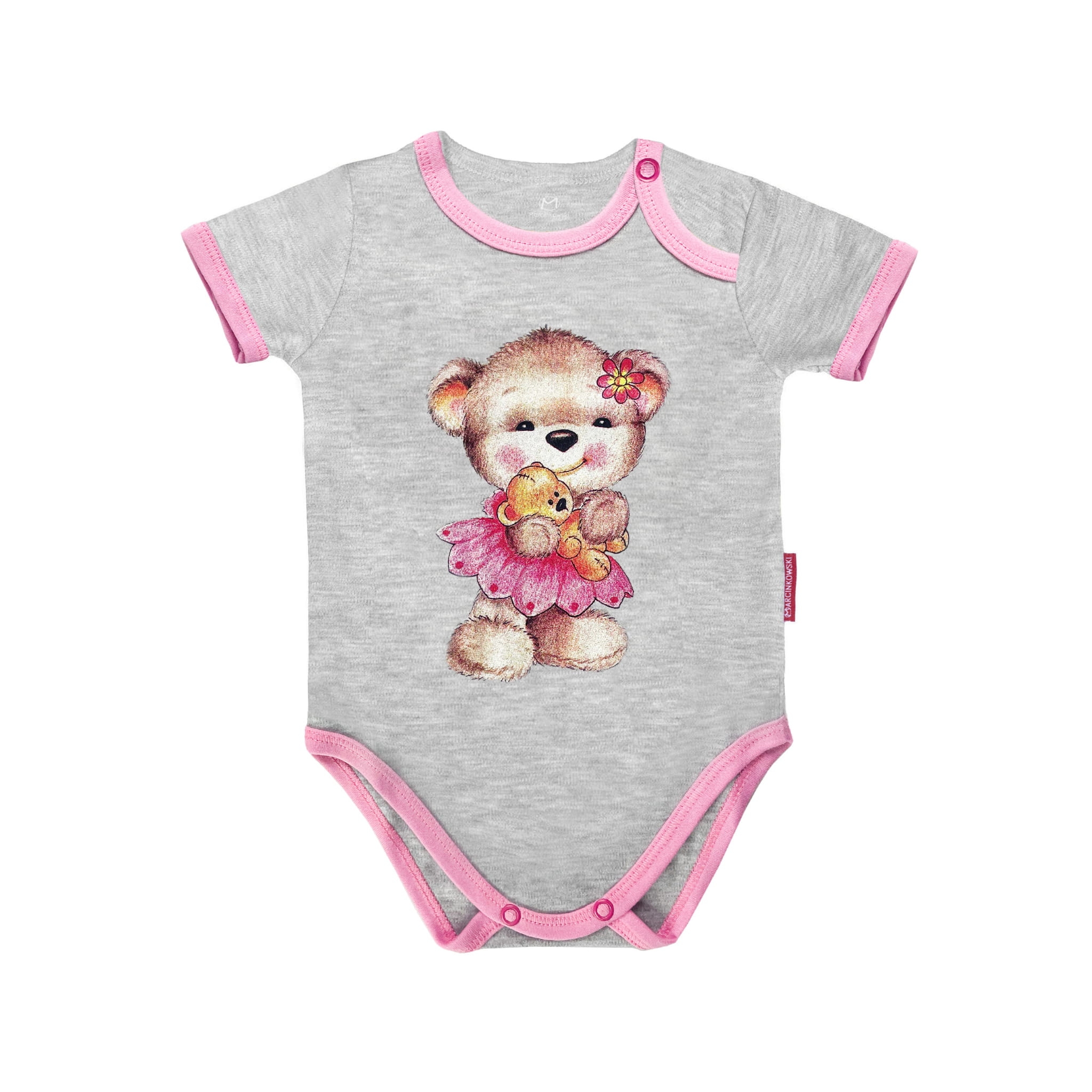 Bawełniane body dziecięce dla niemowląt, z krótkim rękawem firmy Marcinkowski. Kolor szary melanż, różowe obszycie, z nadrukiem z misiem z lalą. Zapięcie przy szyi ułatwiające zakładanie. Body niemowlęce/ dziecięce wykonane są w 100% z bawełny czesanej, która jest miękka, delikatna i bardzo komfortowa dla skóry najmłodszych. Aby mieć pewność, że nasze body będą najlepsze dla Twojego dziecka do ich produkcji używamy bezniklowe, nieuczulające napy niemieckiej firmy Prym. Nie używamy metek tylko niedrażniących wlepek. Body niemowlęce/ dziecięce na krótki rękaw z misiem będą idealne dla Twojej małej dziewczynki. Ubranko to doskonały pomysł na prezent dla dziecka.