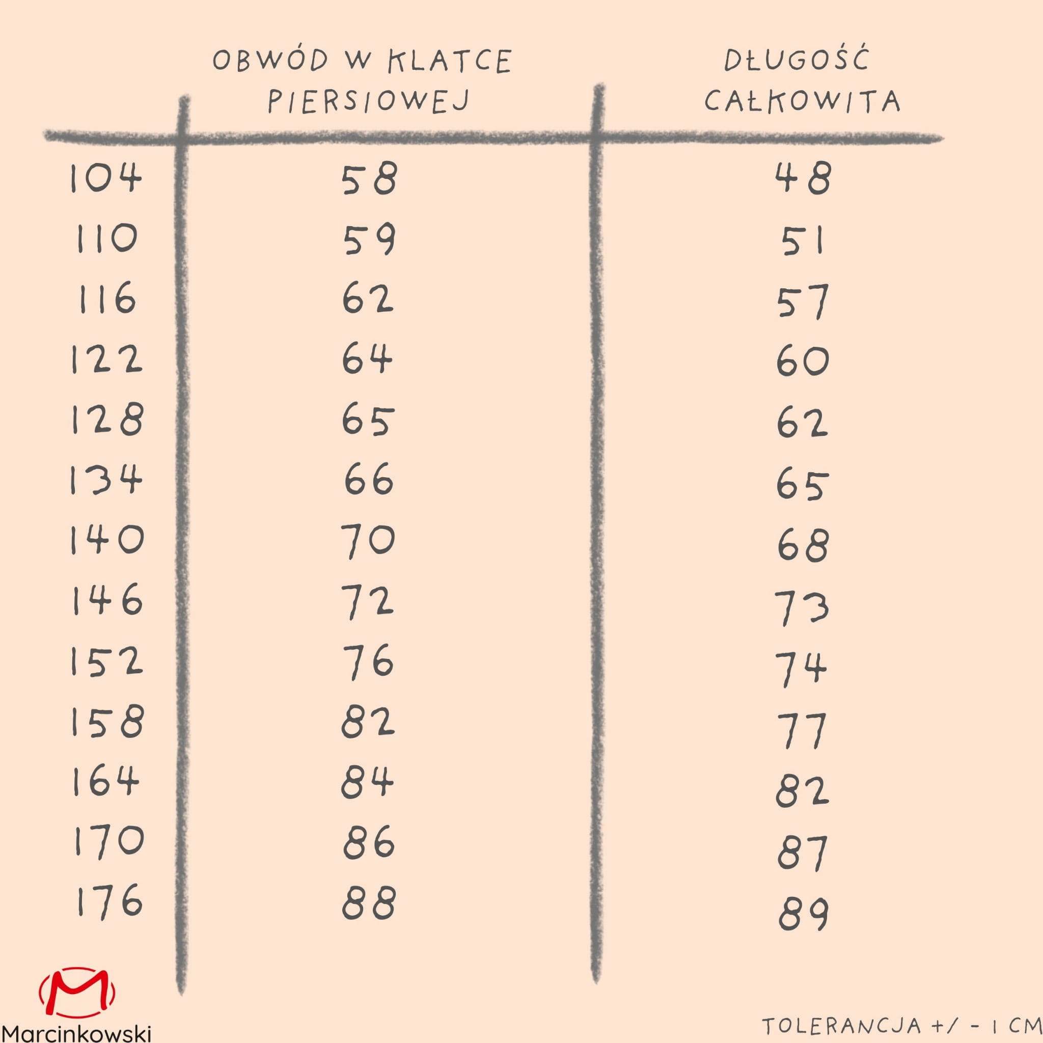 - Rozmiary: 104, 110, 116, 122, 128, 134, 140, 146, 152, 158, 164, 170, 176