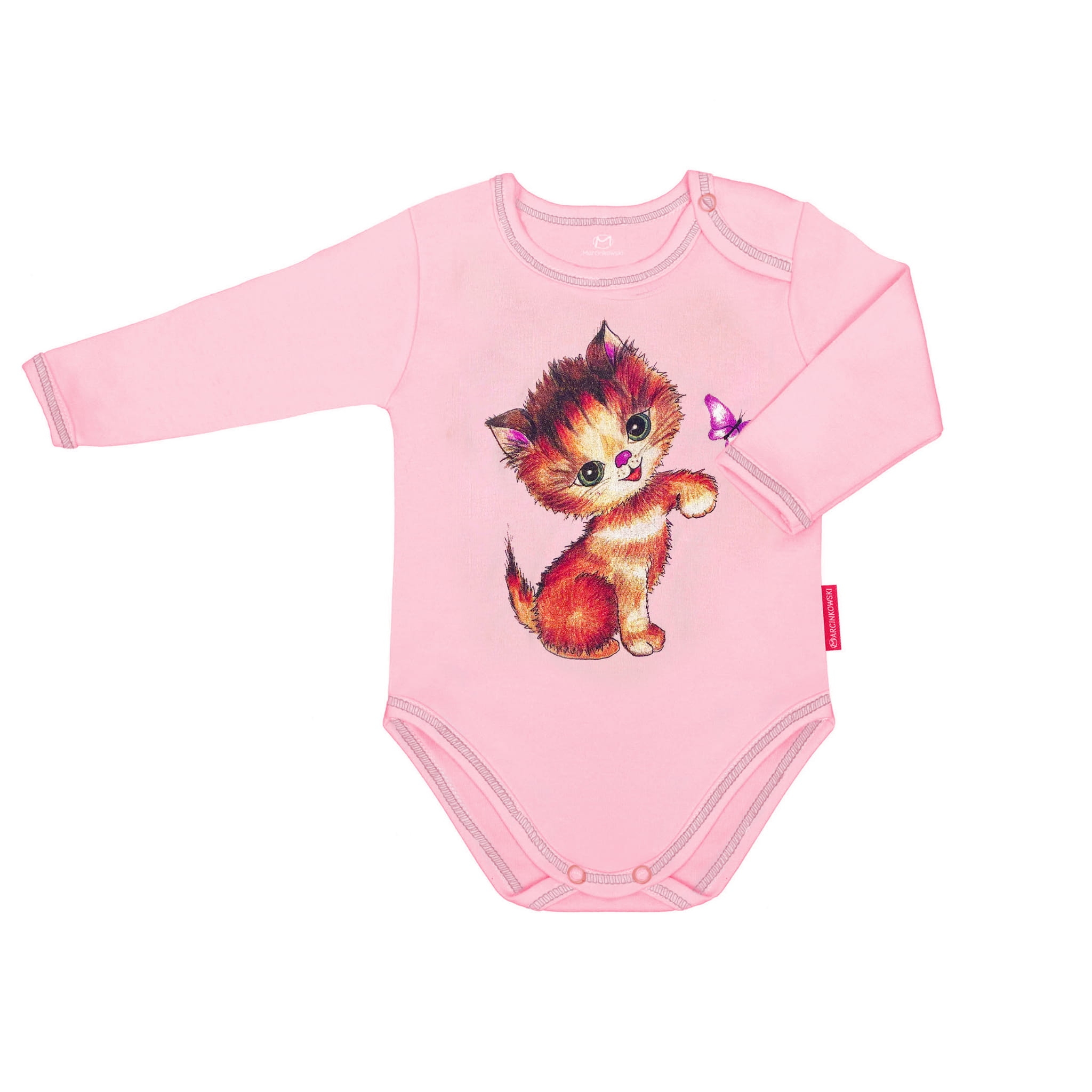 Bawełniane body dziecięce dla niemowląt, z długim rękawem firmy Marcinkowski. Kolor różowy, z nadrukiem z kotkiem. Zapięcie przy szyi ułatwiające zakładanie. Body niemowlęce/ dziecięce wykonane są w 100% z bawełny czesanej, która jest miękka, delikatna i bardzo komfortowa dla skóry najmłodszych. Aby mieć pewność, że nasze body będą najlepsze dla Twojego dziecka do ich produkcji używamy bezniklowe, nieuczulające napy niemieckiej firmy Prym. Nie używamy metek tylko niedrażniących wlepek. Body niemowlęce/ dziecięce na długi rękaw z kotkiem będą idealne dla Twojej małej dziewczynki. Ubranko to doskonały pomysł na prezent dla dziecka.