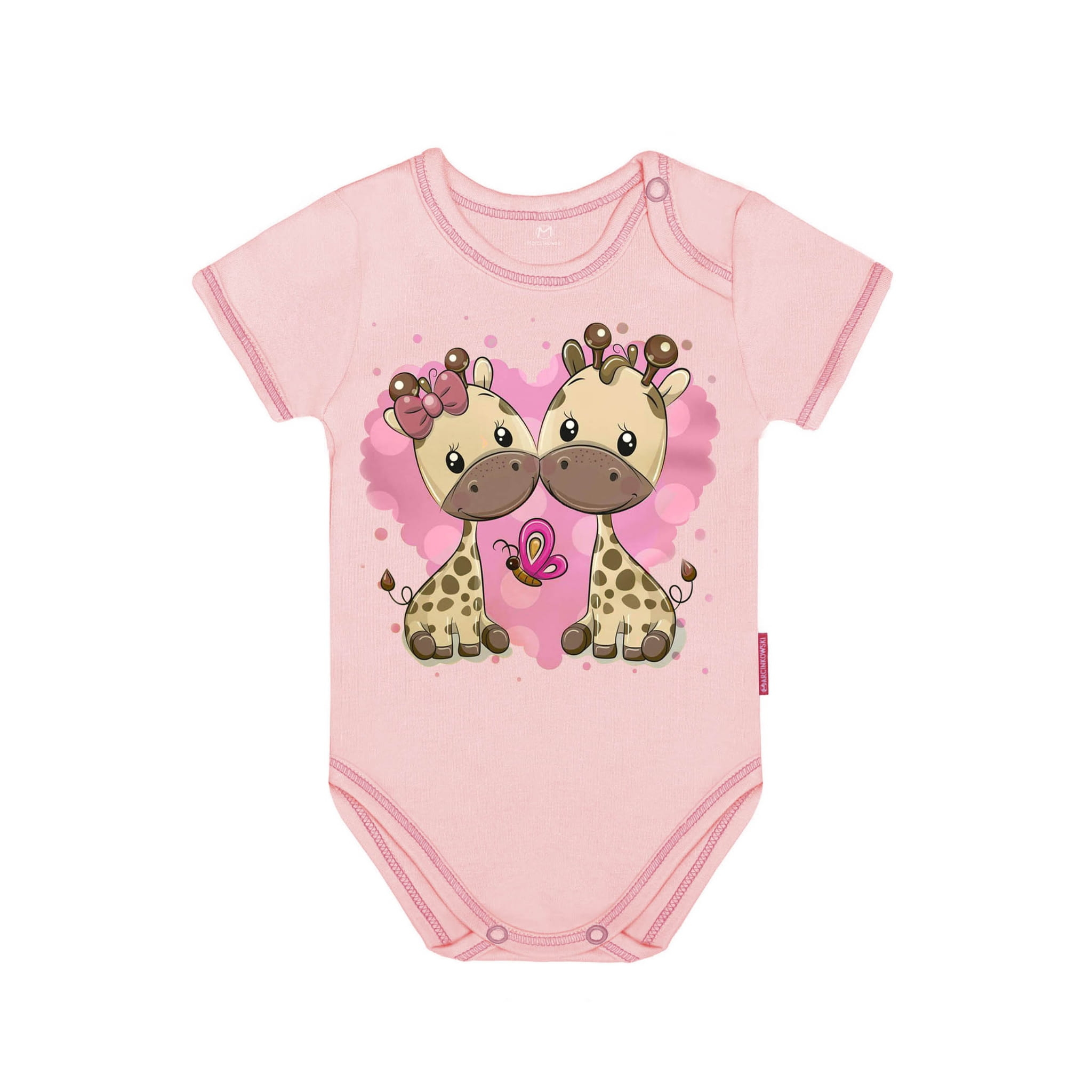 Bawełniane body dziecięce dla niemowląt, z krótkim rękawem firmy Marcinkowski. Kolor różowy, z nadrukiem zakochane żyrafy. Zapięcie przy szyi ułatwiające zakładanie. Body niemowlęce/ dziecięce wykonane są w 100% z bawełny czesanej, która jest miękka, delikatna i bardzo komfortowa dla skóry najmłodszych. Aby mieć pewność, że nasze body będą najlepsze dla Twojego dziecka do ich produkcji używamy bezniklowe, nieuczulające napy niemieckiej firmy Prym. Nie używamy metek tylko niedrażniących wlepek. Body niemowlęce/ dziecięce na krótki rękaw z żyrafkami będą idealne dla Twojej małej dziewczynki. Ubranko to doskonały pomysł na prezent dla dziecka.
