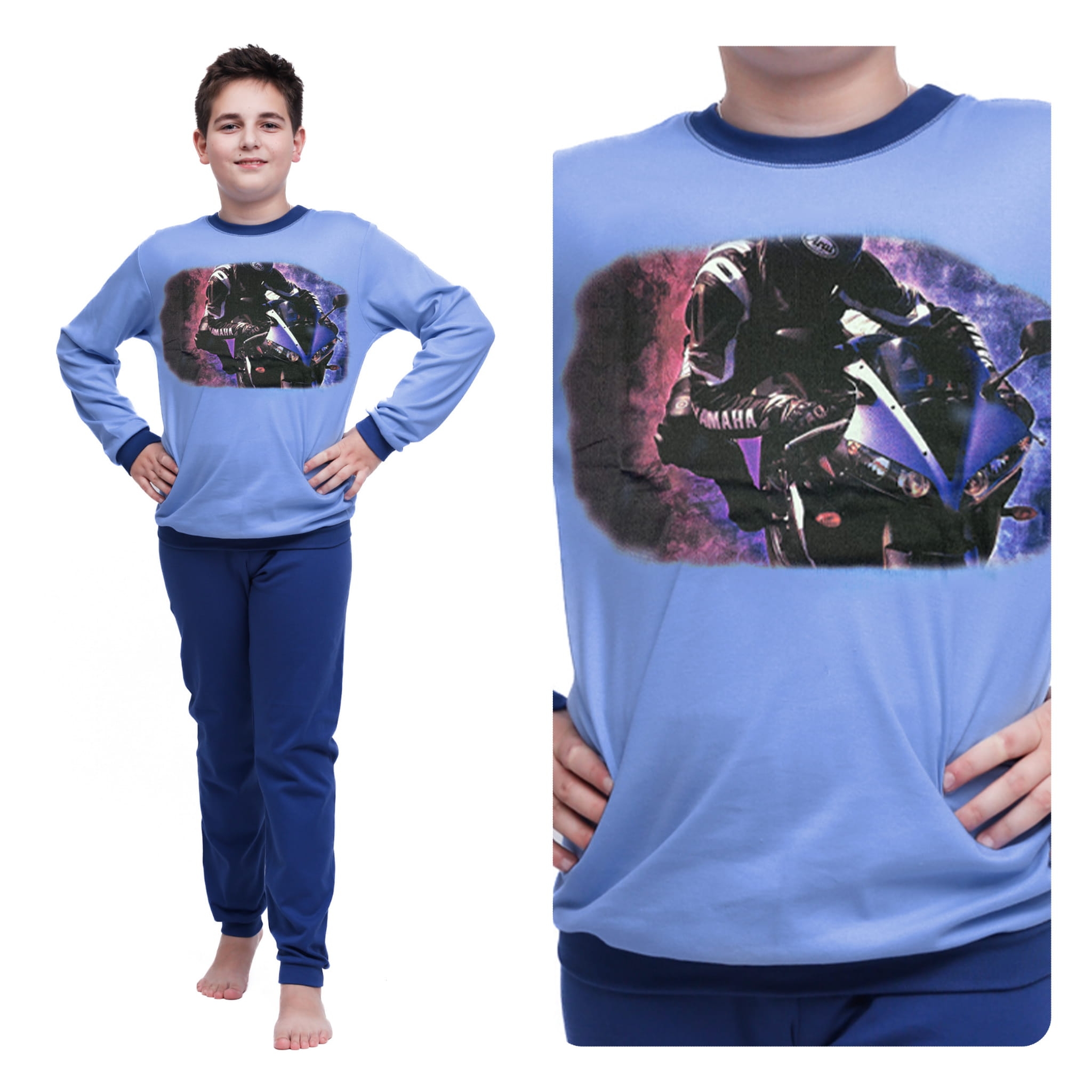 Długa piżama dla chłopca z nadrukiem motocykl, w kolorach: niebieskim/ granatowym. Piżama chłopięca posiada długi rękaw i długie spodnie. Spodnie posiadają ściągacze przy nogawkach. Bluzka wykończona ściągaczem w kontrastowym kolorze. Ciepła piżama dziecięca/ młodzieżowa z długim rękawem wykonana została z grubej bawełny, dzięki czemu Twoje dziecko nie zmarznie w nocy. Piżamka jest bardzo wygodna, została uszyta z miękkiej, delikatnej i oddychającej bawełny. W pasie wszyta wygodna i nieuciskająca gumka. Spraw przyjemność swojemu synkowi albo wnuczkowi- nasza piżama chłopięca to świetny pomysł na prezent dla dziecka.