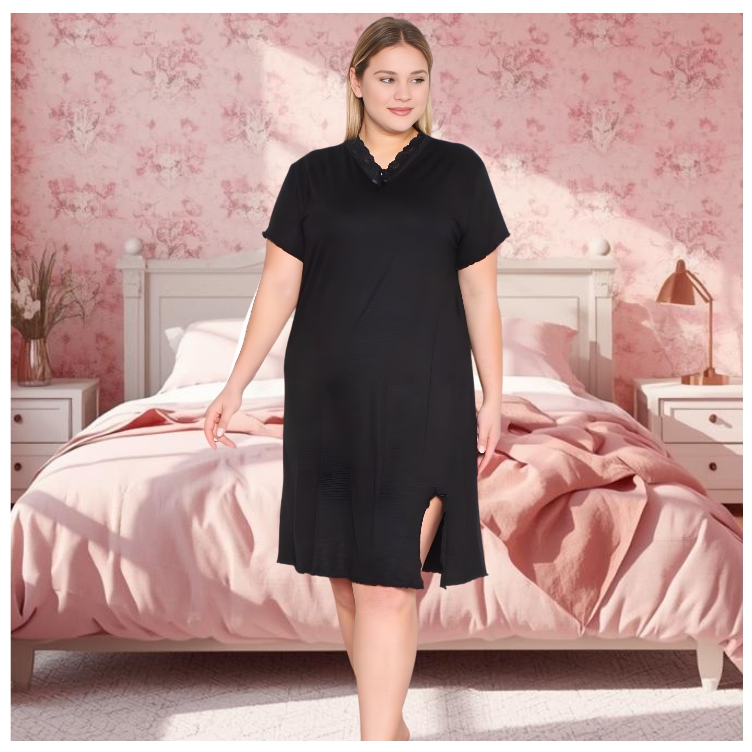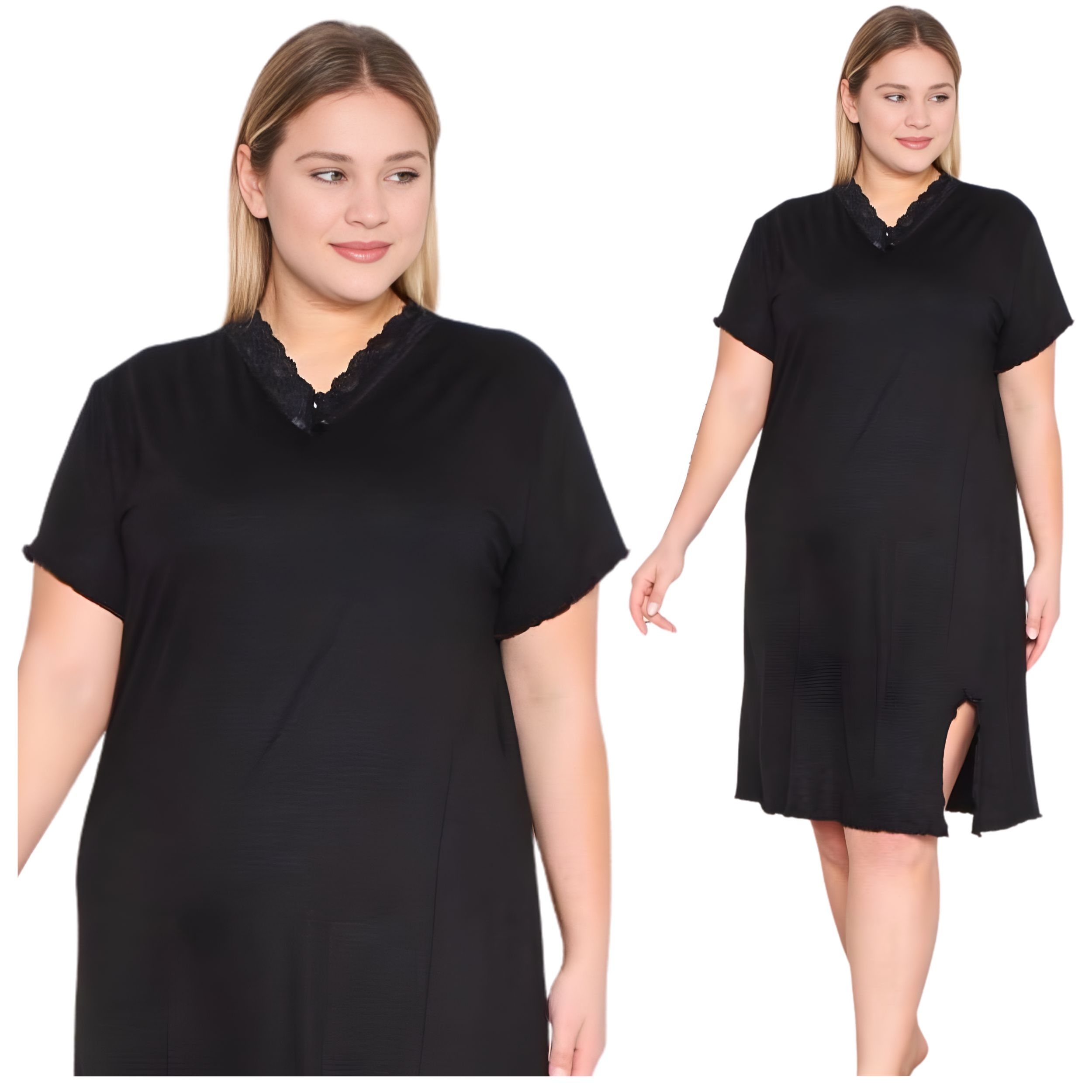 Elegancka czarna koszula nocna z wiskozy w rozmiarach 5XL–7XL łączy wygodę z subtelnym, zmysłowym wykończeniem. Dekolt ozdobiony delikatną koronką dodaje uroku i kobiecej elegancji. Krótki rękaw i lekki, swobodny krój zapewniają pełen komfort noszenia. Dyskretny rozporek u dołu zwiększa wygodę i swobodę ruchów. To doskonały wybór dla pań poszukujących komfortowej, a zarazem stylowej bielizny nocnej.