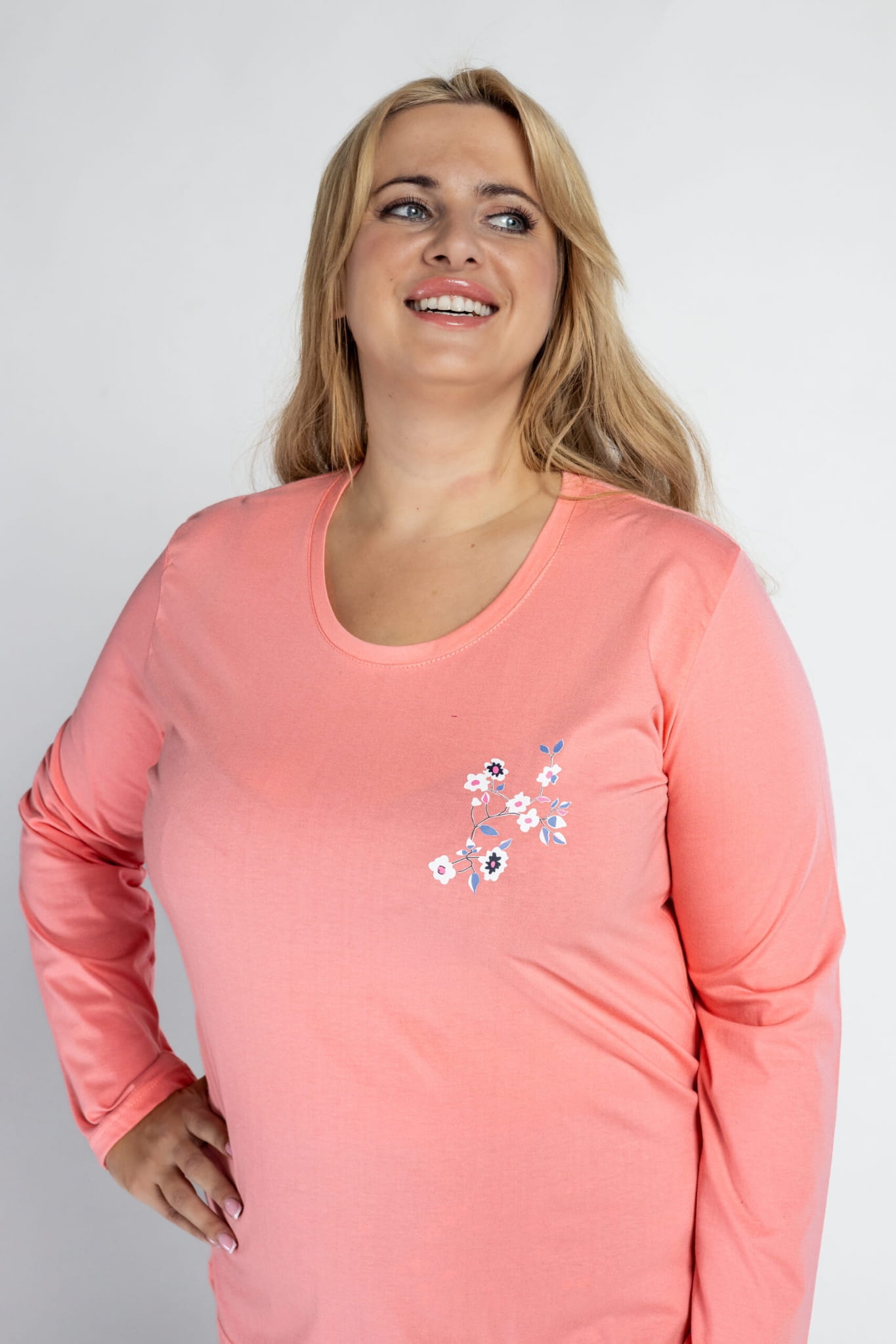 Bawełniana piżama damska z długim rękawem i długimi spodniami. Spodnie mają szeroką gumkę w pasie. Piżama jest niezwykle elegancka, a jednocześnie wygodna i miła w dotyku. Bluzka z ozdobnym kwiatkiem na piersi, spodnie w pasujące do bluzki kwiatki.