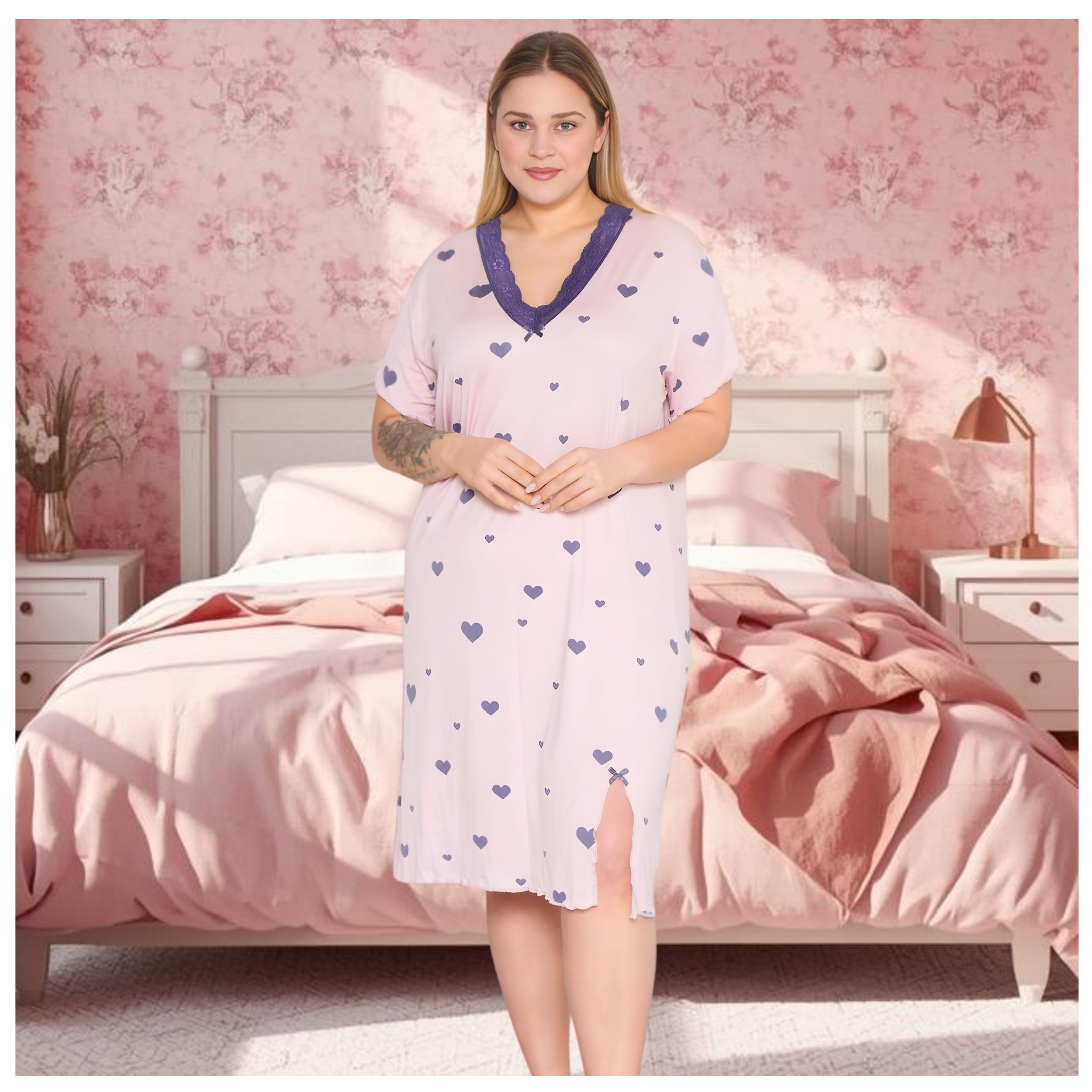 Komfortowa koszula nocna w rozmiarach 5XL, 6XL i 7XL wykonana z delikatnej wiskozy zapewnia wyjątkową miękkość i wygodę. Tkanina doskonale przepuszcza powietrze, co gwarantuje uczucie świeżości przez całą noc. Luźny, dopracowany krój subtelnie dopasowuje się do ciała. Kobiecy wzór w serduszka dodaje uroku i sprawia, że model prezentuje się wyjątkowo. Idealna dla kobiet, które cenią komfort oraz estetykę w większych rozmiarach.