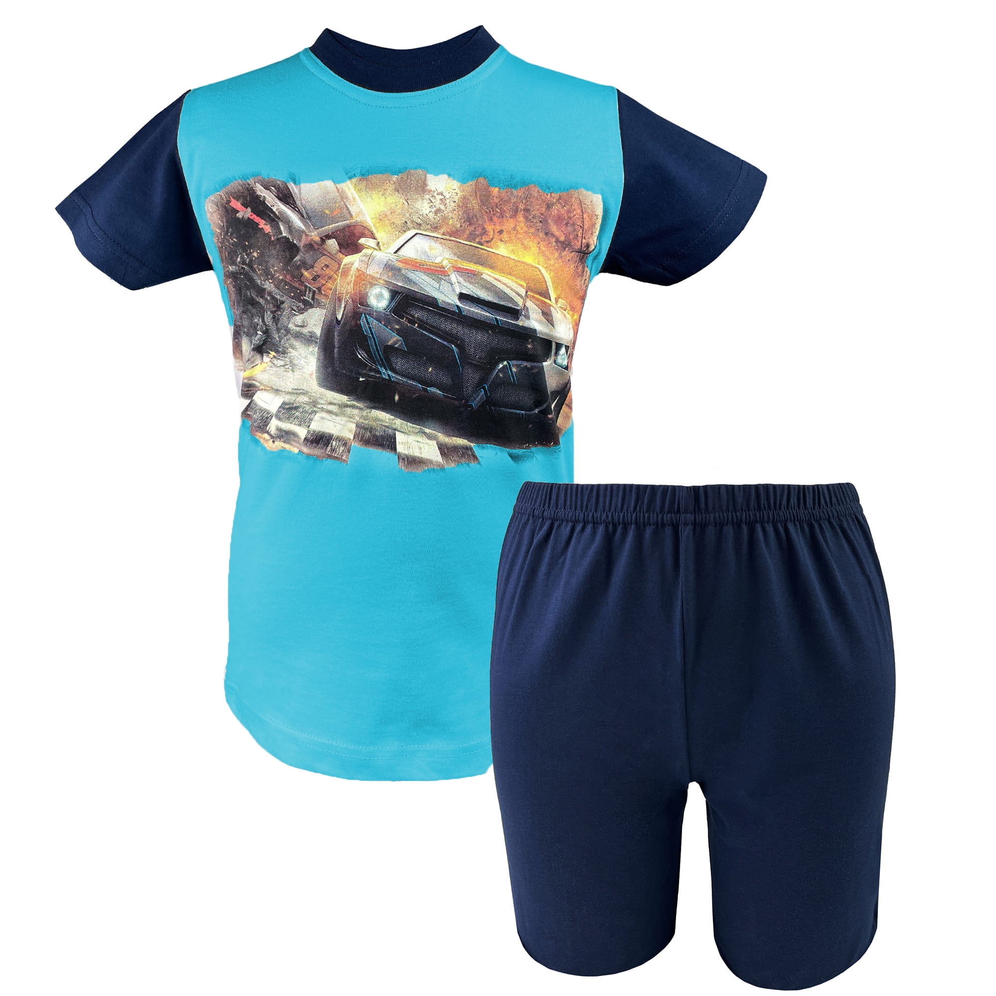 Letnia piżama dziecięca/ młodzieżowa dla chłopca w kolorach: granatowy/turkusowy. W zestawie znajdują się bluzka z krótkim rękawem i krótkie spodenki. Bluzka wykończona dekoltem w łódkę z kontrastowym ściągaczem. Na przodzie bluzki znajduje się nadruk samochód/ wyścigówka, który można prasować nie martwiąc się o uszkodzenie. Nasza piżama chłopięca z krótkim rękawem to idealny wybór na wiosnę i lato. Piżama świetnie sprawdzi się na letnie wyjazdy i kolonie.