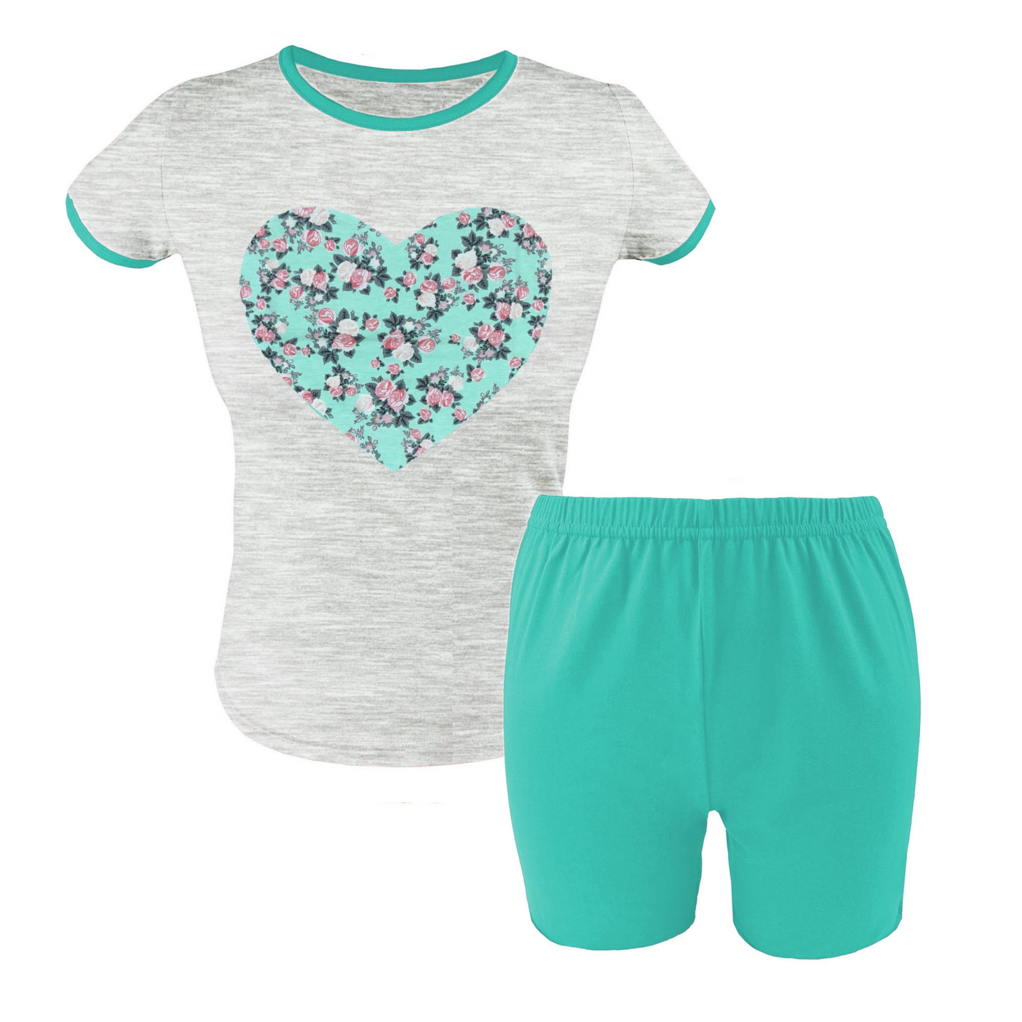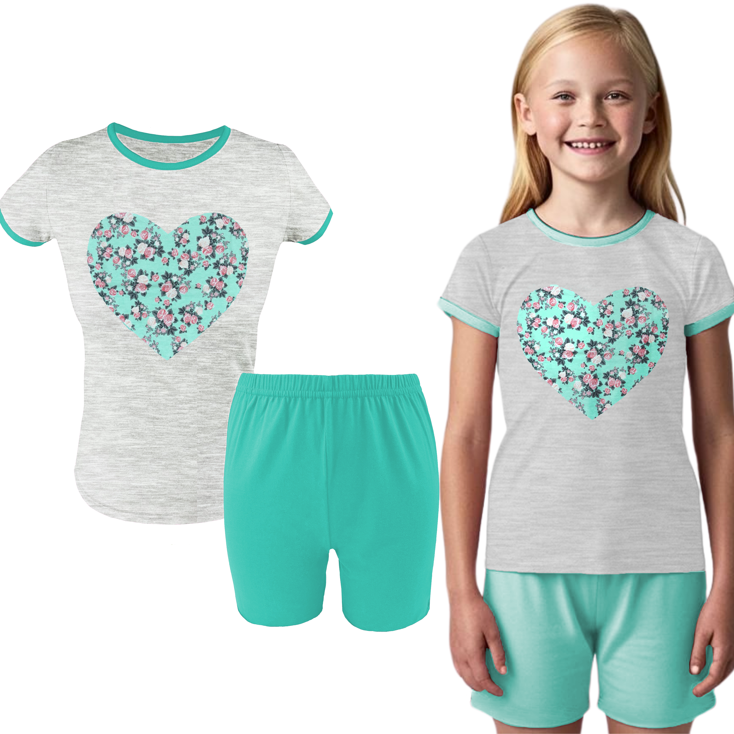Letnia piżama dziecięca dla dziewczynki z krótkim rękawem i spodenkami wykonana ze 100% bawełny. Bluzka z dużym naszytym serduszkiem w komplecie z pasującymi spodenkami. Całość wykończona lamówką, która dodaje charakteru całej stylizacji. Piżama dziewczęca to niezbędny strój nocny w szafie każdej młodej damy. Krótka bawełniana piżama idealnie sprawdzi się na lato, wyjazdy wakacyjne i kolonie.