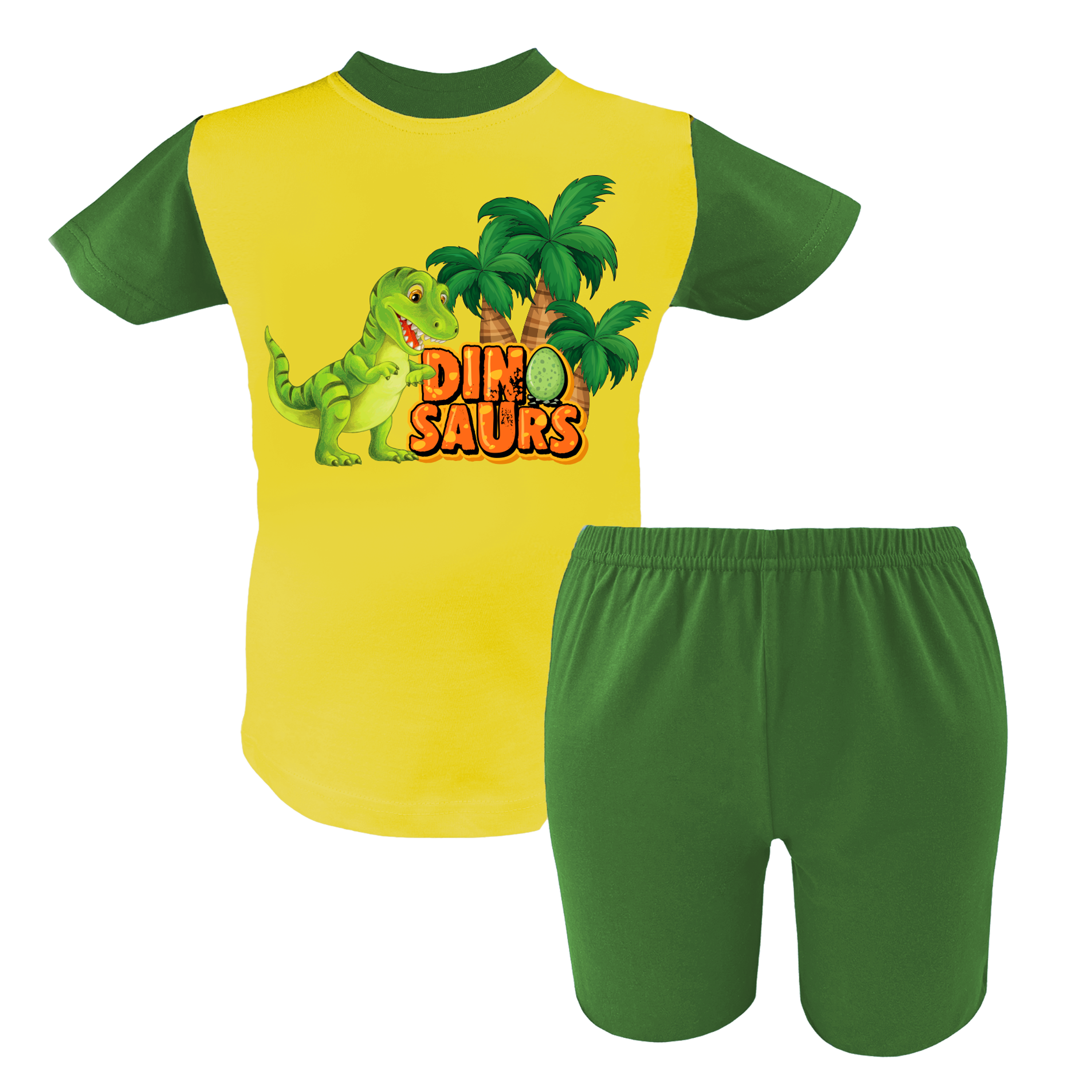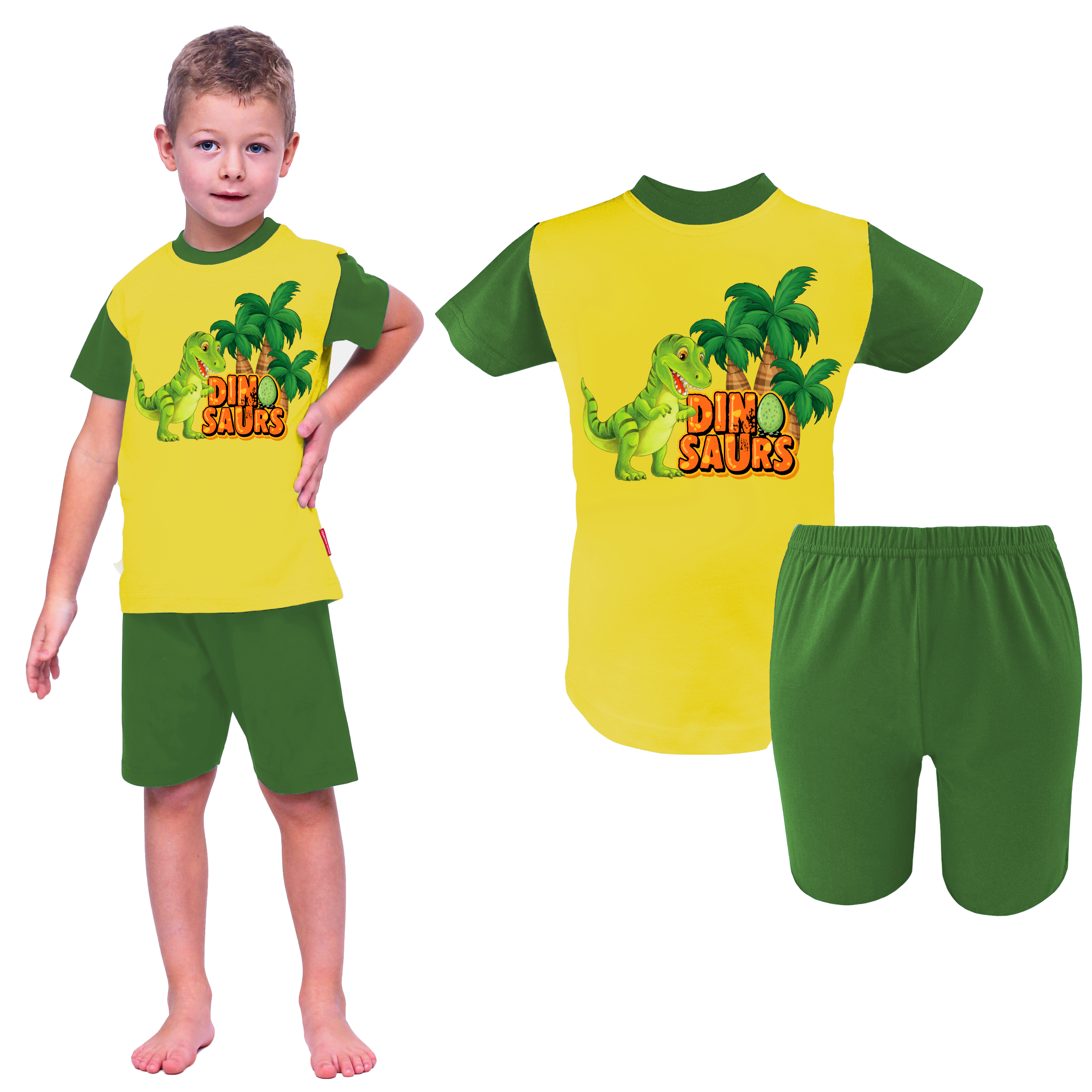 Letnia piżama dziecięca dla chłopca w kolorach: żółty/ zielony. W zestawie znajdują się bluzka z krótkim rękawem i krótkie spodenki. Bluzka wykończona dekoltem w łódkę z kontrastowym ściągaczem. Na przodzie bluzki znajduje się nadruk z dinozaurem, który można prasować nie martwiąc się o uszkodzenie. Nasza piżama chłopięca na krótki rękaw to idealny wybór na wiosnę i lato. Piżama świetnie sprawdzi się na letnie wyjazdy i ciepłe noce.