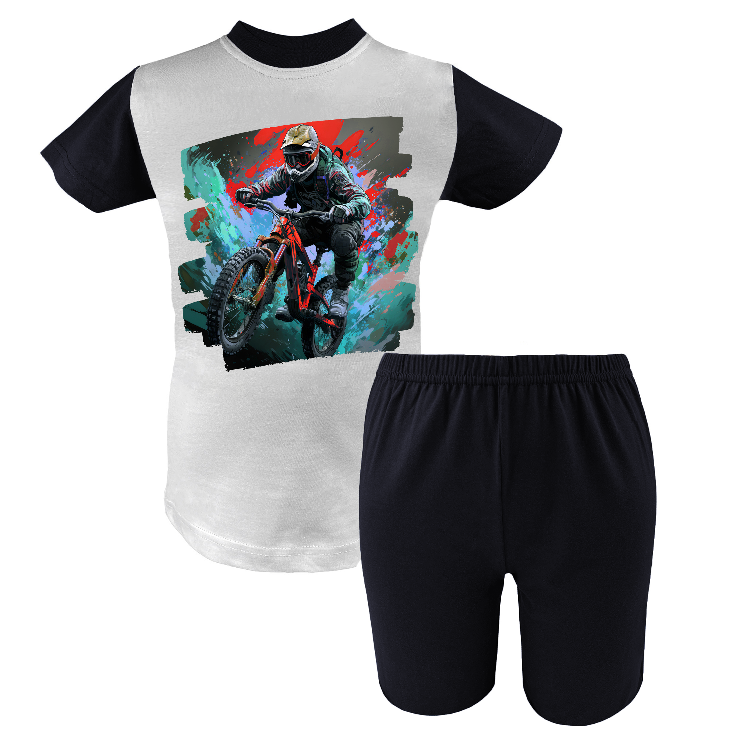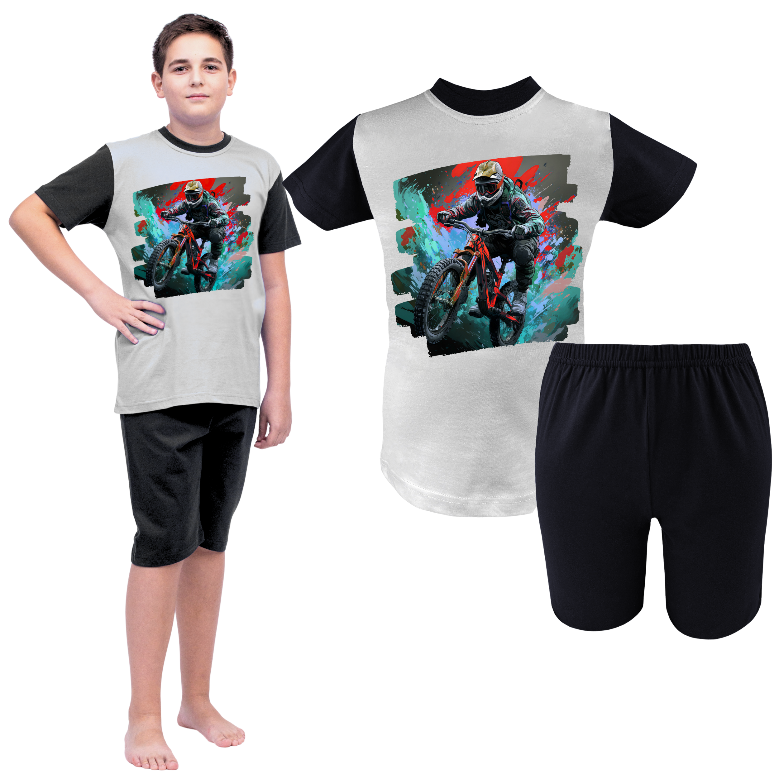 Letnia piżama dziecięca/ młodzieżowa dla chłopca w kolorach: szary/czarny. W zestawie znajdują się bluzka z krótkim rękawem i krótkie spodenki. Bluzka wykończona dekoltem w łódkę z kontrastowym ściągaczem. Na przodzie bluzki znajduje się nadruk z rowerzysta BMX, który można prasować nie martwiąc się o uszkodzenie. Nasza piżama chłopięca na krótki rękaw to idealny wybór na wiosnę i lato. Piżama świetnie sprawdzi się na letnie wyjazdy i kolonie.