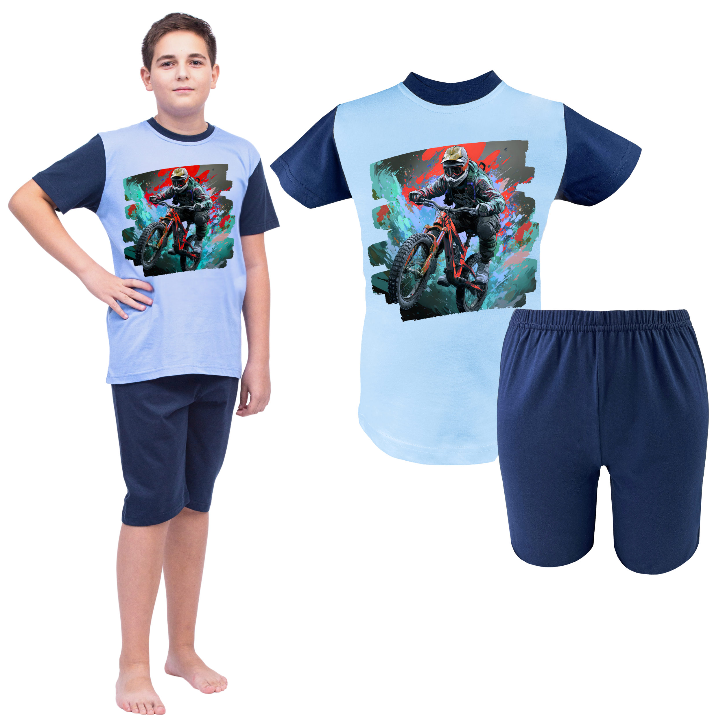 Letnia piżama dziecięca/ młodzieżowa dla chłopca w kolorach: niebieski/granatowy. W zestawie znajdują się bluzka z krótkim rękawem i krótkie spodenki. Bluzka wykończona dekoltem w łódkę z kontrastowym ściągaczem. Na przodzie bluzki znajduje się nadruk z rowerzysta BMX, który można prasować nie martwiąc się o uszkodzenie. Nasza piżama chłopięca na krótki rękaw to idealny wybór na wiosnę i lato. Piżama świetnie sprawdzi się na letnie wyjazdy i kolonie.