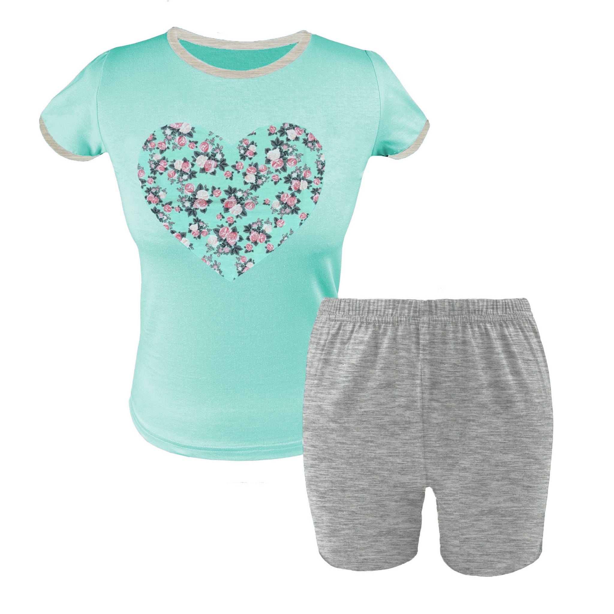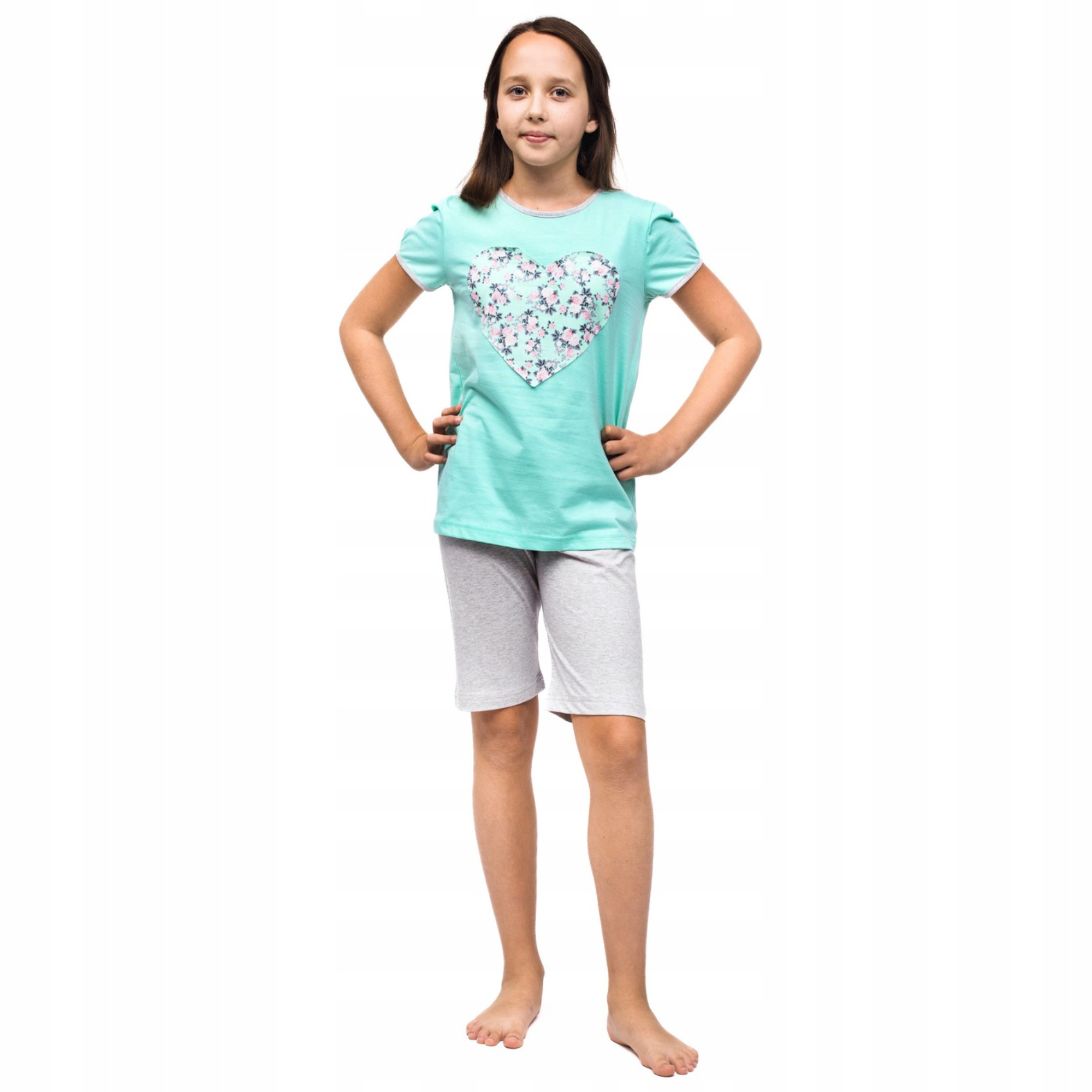 Letnia piżama dziecięca dla dziewczynki z krótkim rękawem i spodenkami wykonana ze 100% bawełny. Bluzka z dużym naszytym serduszkiem w komplecie z pasującymi spodenkami. Całość wykończona lamówką, która dodaje charakteru całej stylizacji. Piżama dziewczęca to niezbędny strój nocny w szafie każdej młodej damy. Krótka bawełniana piżama idealnie sprawdzi się na lato, wyjazdy wakacyjne i kolonie.