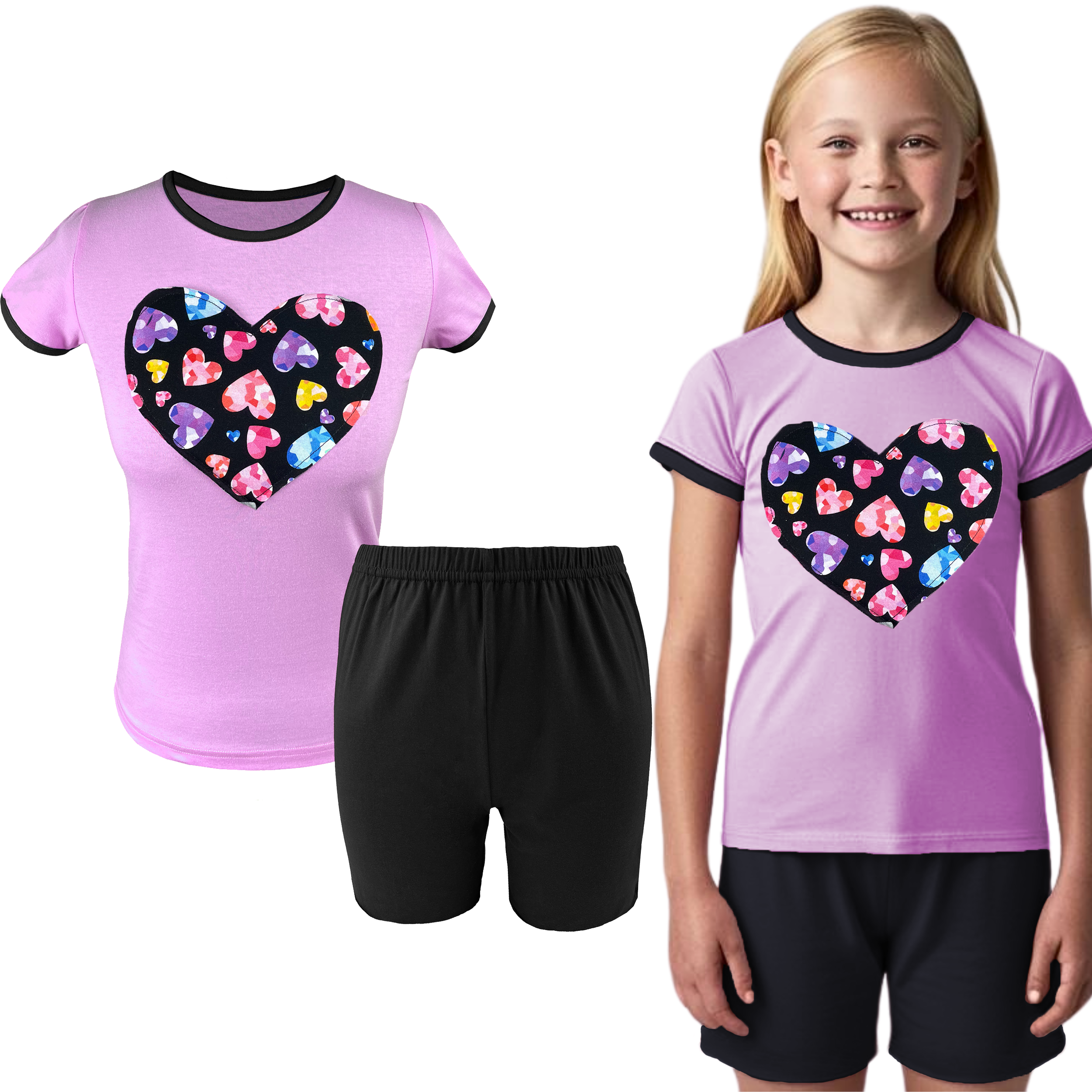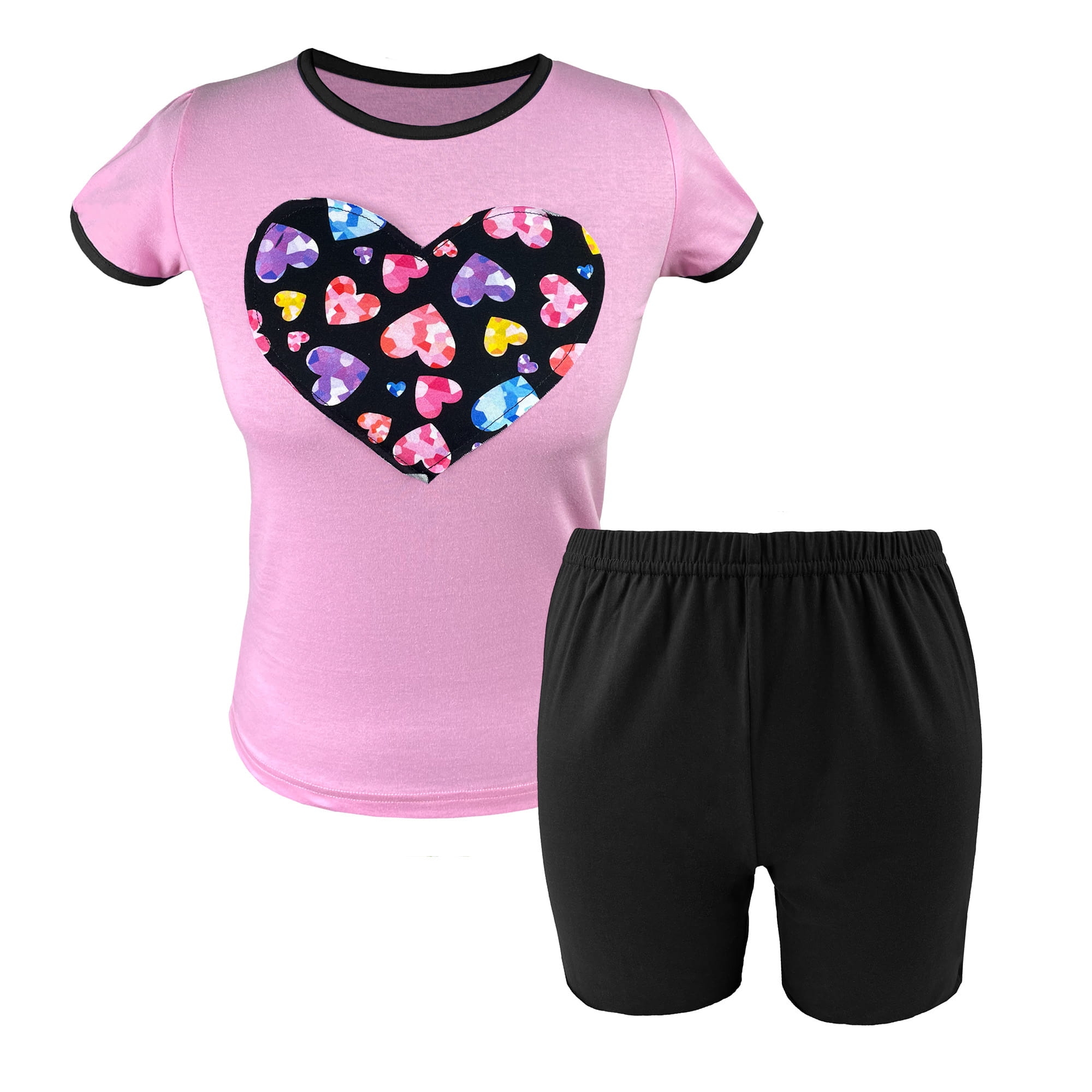 Letnia piżama dziecięca dla dziewczynki z krótkim rękawem i spodenkami wykonana ze 100% bawełny. Bluzka z dużym naszytym serduszkiem w komplecie z pasującymi spodenkami. Całość wykończona lamówką, która dodaje charakteru całej stylizacji. Piżama dziewczęca to niezbędny strój nocny w szafie każdej młodej damy. Krótka bawełniana piżama idealnie sprawdzi się na lato, wyjazdy wakacyjne i kolonie.
