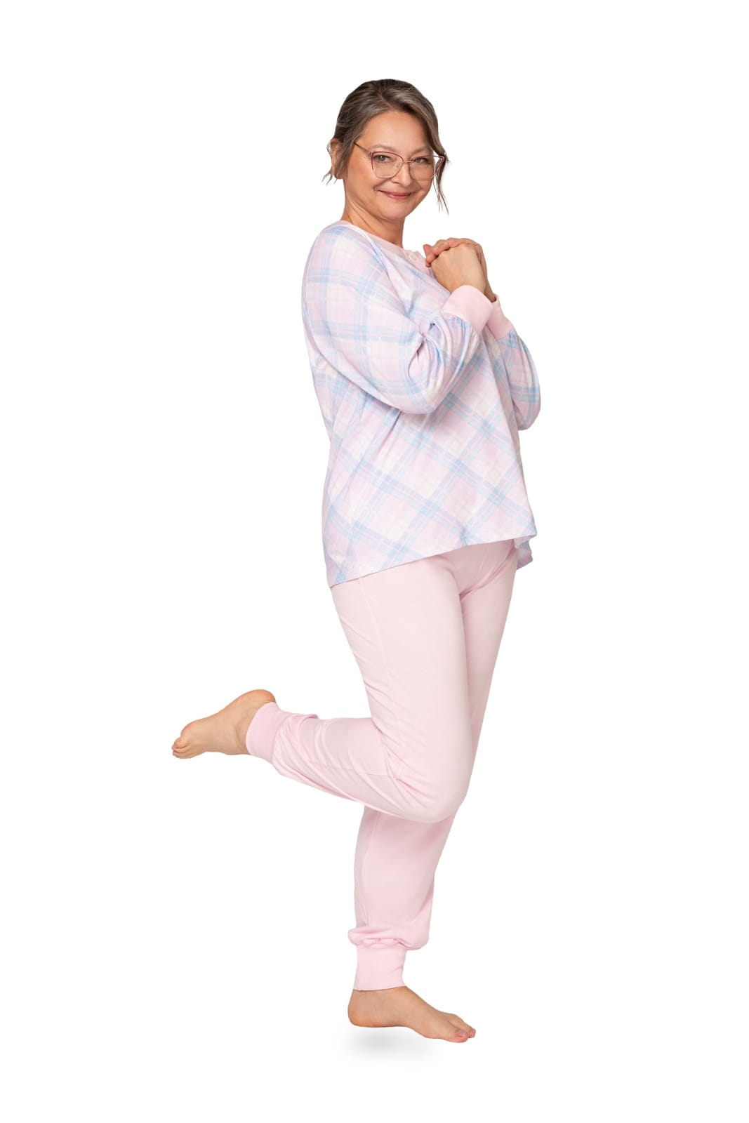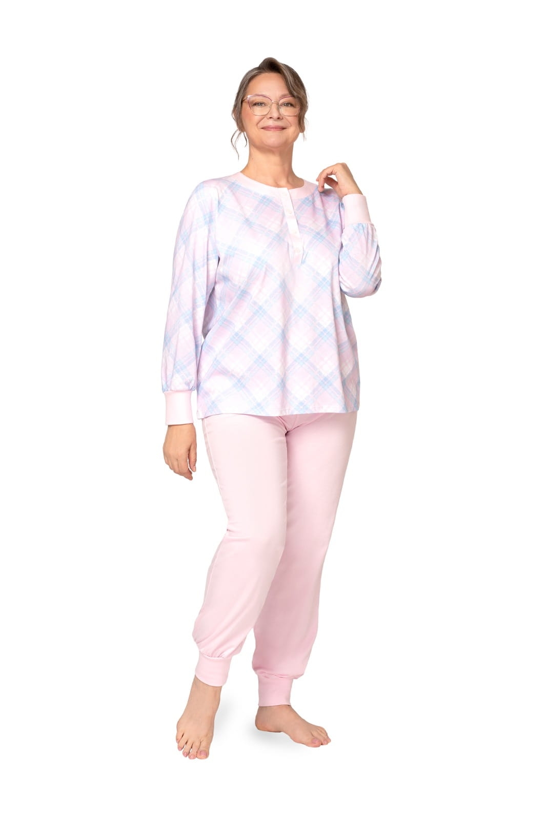 Bawełniana piżama damska z długim rękawem i długimi spodniami. Bluzka wciągana, gładka, rozpinany dekolt na 4 guziki. Dekolt okrągły, bluzka wykończona lamówką pasująca kolorem do spodni. Spodnie posiadają szeroką, wygodną gumę w pasie. Piżama jest bardzo elegancka, a zarazem wygodna i przyjemna w dotyku. Delikatny, różowy kolor sprawia, że piżama jest bardzo kobieca. Długi rękaw oraz nogawka zakończone ściągaczem.